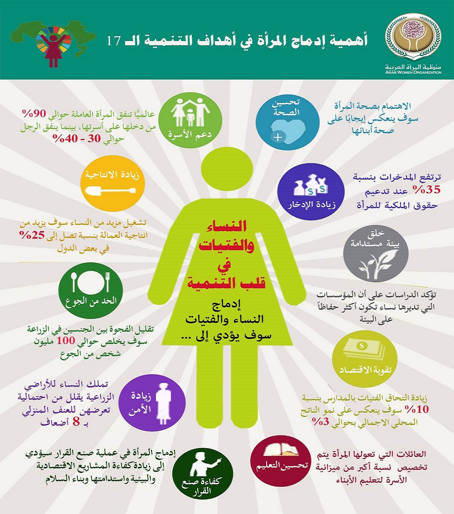 تؤمن منظمة المرأة العربية أن المرأة هي مفتاح تحقيق التنمية المستدامة وأن قضايا المرأة متشابكة في جميع المجالات ولا بد من معالجتها بنهج متكامل إذا أردنا تحقيق تنمية مستدامة حقيقية على المدى الطويل، فتمكين المرأة وتحقيق المساواة بين الجنسين يشكل أساسا من الأسس الضرورية اللازمة لتحقيق التنمية المستدامة وإحلال السلام والأمن المجتمعي والرخاء في الوطن العربي، كما ان توفير التكافؤ أمام النساء والفتيات في الحصول على التعليم، والرعاية الصحية، والعمل اللائق، والتمثيل في العمليات السياسية والاقتصادية واتخاذ القرارات سيكون بمثابة وقود لتحقيق التنمية الاقتصادية في المنطقة العربية.